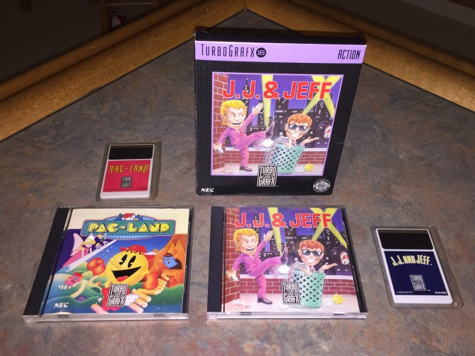 In this post I will be talking about two very traditional platformers in my collection that are available for the TurboGrafx-16, JJ & Jeff and Pac-Land. JJ & Jeff is an oddball game where you control one of the two private investigators on a mission to solve a kidnapping of a wealthy man. Despite the misleading title, JJ & Jeff does not allow for co-op play or even two player back and forth. Regardless of which character you choose on your adventure, the other character feels slighted you left him out so he pops up throughout the game in the background peeing, pooping or being a general nuisance and potentially thwarting your efforts. Yes, I said peeing and pooping. It’s more obvious in the Japanese version of the game that the toilet humor is in full effect but in the U.S. the stream of pee has been removed and instead of the character crouching behind a bush with a flushed red face while straining to poop, all you see is the character with a bear suit on. Not to mention there is an attack in the game where if you crouch you can spray air at an enemy with a bottle. In the Japanese version of the game, you instead turn around and fart at your enemy! These were literally the only redeeming qualities of what is a generic platformer and they’ve been sanitized. Yes, birds still poop on you from above but that’s not the same. The game still retains the scenes where you go into doors to find your jilted crime solving partner spouting off a bizarre phrase before refilling your life bar so there’s that. Otherwise, your job is to run, jump and kick your way through repetitive levels of forests, caves and clouds until you reach the level bosses. The level bosses are all the same sprite, a beefy looking bad guy that throws rocks. Your kick him a few times and he’s gone. Don’t get me wrong, JJ & Jeff may be simple but it’s not easy. Think Adventure Island difficulty with your momentum constantly throwing you off ledges when you try to stop on a dime. As a result, there are plenty of chasms to fall into and your life meter will slowly run out as your progress through each level unless you refill by eating fruit you find by kicking EVERYTHING. If you decide to just speed run through the levels you’ll be fine, otherwise you’ll find yourself kicking everything in site just to see if a coin or a piece of fruit or a hidden door will open. You have to find a key in each level as well and they all have to be found by kicking stuff so kick away until you can’t kick anymore. Personally, even if the toilet humor was intact, I would still find JJ & Jeff way too repetitive and frustratingly difficult to spend a lot of time with. It’s still better than Pac-Land though.
