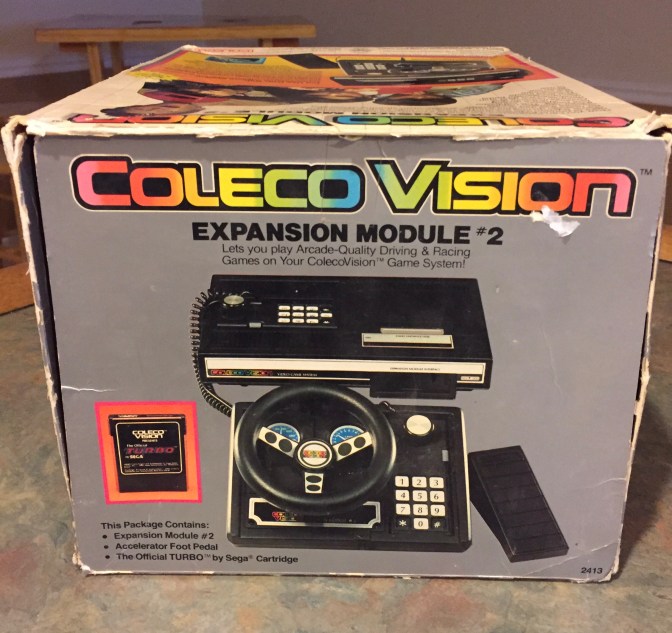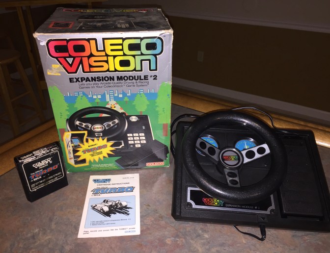 So what do you use the steering wheel for? Well, there are a few games that are compatible with the wheel, but the game most commonly associated with it would be Sega’s Turbo. Turbo is an arcade port (shocker!) of the popular racing game that actually preceded the most famous racing game of the era, Pole Position. The Colecovision port of Turbo came bundled with the steering wheel and it can only be played using the wheel so the two a loose copy of Turbo without the wheel doesn’t do you any good. In Turbo, you’re racing your car against opponents across varied landscapes such as cities, forests, mountains, tunnels, etc. as well as day/evenings. As is expected in racing games from the 80’s, there are additional hazards such as oil slicks, ice and ambulances (?!?!). You must pass 30 cars in the allotted time to gain additional time and continuing on in the game. I thankfully have the box to go with my wheel and always happy to have the extra cardboard when I can. These 2nd generation systems, games and peripherals are getting harder and harder to find complete in box as you might expect from 35 year old media. The Colecovision did a great job of providing a stellar racing experience for their home console. Turbo is simple, effective, extremely fun and is an awesome racing game and the perfect title to sell Coleco’s “expansion module”.
