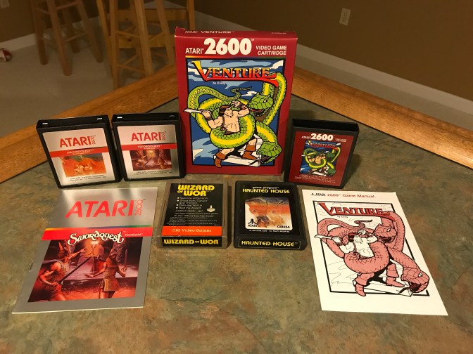 A sense of adventure and an active imagination were required to enjoy many Atari VCS/2600 games. The instruction manuals, box art and in the case of the Swordquest series, comic books, gave the players an idea of what the rudimentary shapes on the screen were meant to portray. Since I never owned an Atari VCS in the 80’s, I always dismissed the true adventure games on the system due to the confusing nature of the gameplay and steep learning curve to accomplish anything of note. I tended to be drawn to instant gratification Atari games that offered arcade experiences at home. Games such as E.T. and Raiders of the Lost Ark are not easy to pick up and play without owning an instruction manual and they perplexed me to no end for the longest time (still kinda do). The concept of what to do and where to go is so vague in these games that popping them in and assuming you could figure it out as you go is completely false. So when the internet came along and I could download and print off the instruction manuals, I did. But I still never game them a worthwhile shot until this month. With that said, I have only so much patience for this genre on the Atari so a couple of the games in this post continue to be ignored.