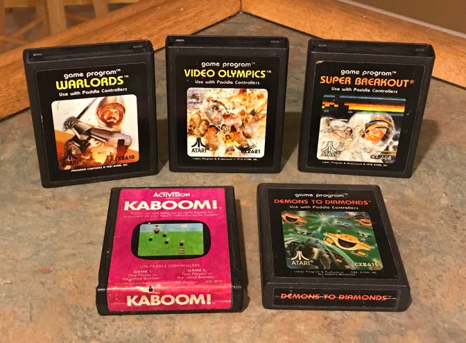 First things first, I love the Atari paddle controllers. Any game that requires the smooth movements that only a paddle controller can provide automatically rates high in my book. There’s just something about how the paddle controllers feel. They are much more ergonomic than the Atari joystick which has a tendency to bruise the inside of your hand after playing awhile. The paddle controllers were created with love and reducing hand cramps in mind. The 5 games in this post are some of the more iconic paddle titles for the Atari.