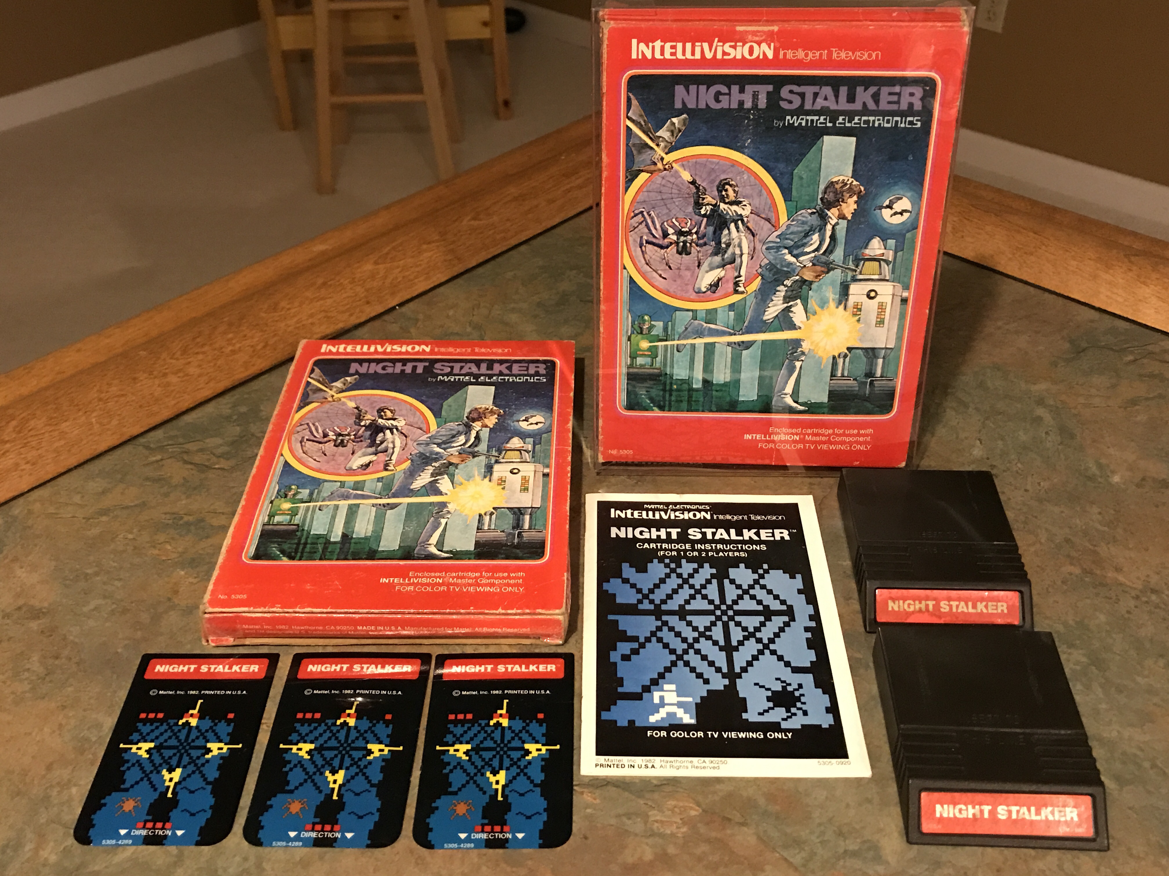 My Intellivision game of the week is Mattel’s classic maze shooter, Night Stalker. Night Stalker took elements from the popular arcade hit, Berzerk (claustrophobic maze filled with deadly robots) and added a dash of haunted house dread to create an uneasy and relentless game. The sound of your racing heart beat is all you are treated to as far as in game music goes. This definitely adds the creepy ambiance necessary for a fully immersive early 80s title.