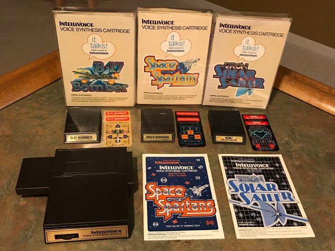 The Intellivoice contains generic synthesized words that could be used with any game for example, the phrase “Mattel Electronics Presents”. Each individual cartridge that Mattel released to be compatible with the Intellivoice would then contain its own game specific words and phrases meant to enhance game play. To get it to work, you simply had to insert the Intellivoice module into the cartridge slot on the side of the console then insert a compatible cartridge into the other side of the Intellivoice. Unsurprisingly due to its high initial cost and the high cost of the games that worked with it, the Intellivoice wasn’t exactly a smashing success. Mattel only released 5 games for the peripheral during its short life span and I own 3 of those.