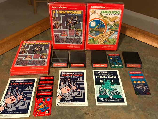 The three games in this post really don’t have anything in common besides being “action” titles on the Intellivision with their red boxes/cartridge labels. Mattel used color coding to differentiate the style of play expected for the games they had a hand in producing for the Intellivision. For example, light blue boxes and cartridge labels meant the game was part of the sports network. Purple was used for the strategy network of games, orange was used for children’s learning, green for gaming, dark blue for space action, etc. Besides being heavy on arcade style action, the games in this post also have the distinction of being some of the better titles for the Intellivision.