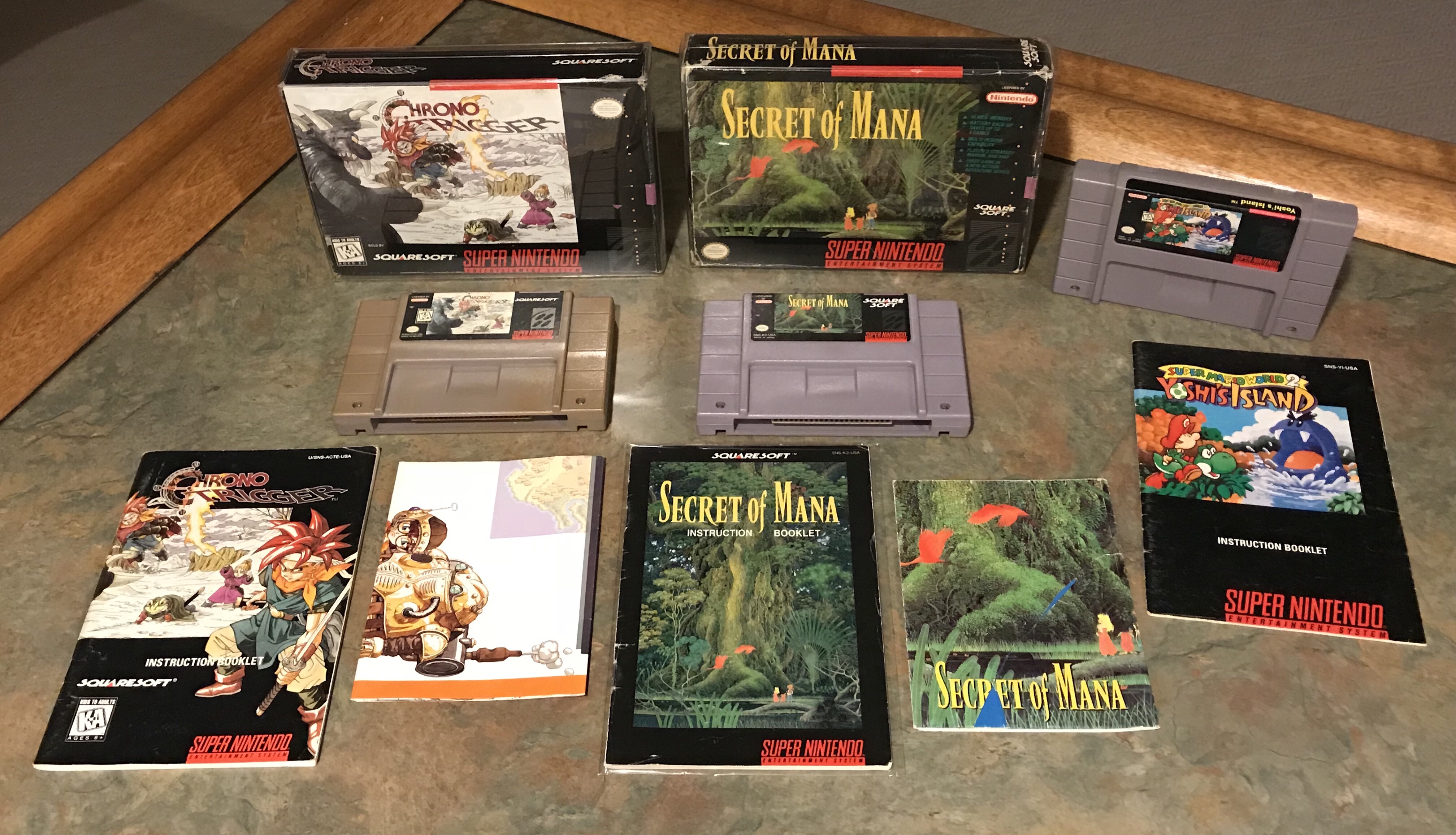 The SNES is now one of the most nostalgia driven systems for collectors and gamers, right up there with the NES. If the NES represented my childhood, the SNES represented my transition into adulthood. While that is still a very memorable time in a young man’s life, it often doesn’t drive the same type of euphoric nostalgia as your childhood does. When it came time to “collect” games from my youth as a young man in my 20’s, I gravitated more towards the NES and systems that came before it such as the Atari 2600, Intellivision and Colecovision. All that really means is that I missed out when SNES games were at their cheapest to purchase. Since I can’t go back in time to hit the nearest Funcoland for cheap SNES and late release NES titles (if only), I attempted to rectify my transgressions by picking up 3 games that appear on many gamers “best of” SNES lists. I bought complete or nearly complete copies of Chrono Trigger (game, manual, map, box) & Secret of Mana (game, manual, map, box) as well as a loose with manual copy of Super Mario World 2: Yoshi’s Island. Only three games you might be thinking? Well, as I mentioned, SNES games have gone up a bit in price over the past 5 or more years so this was all my monthly budget allowed me to buy. Look up what a complete in box Chrono Trigger is going for on eBay and you’ll understand what I mean.