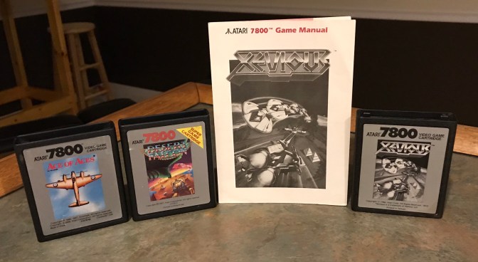 The three games in this post don’t have much in common besides the fact they are on the Atari 7800 and they could be called shooters in some form or fashion. Ace of Aces is a action shooer/flight simulator that originated on PC. Desert Falcon is a pseudo 3D Zaxxon-like shooter where your bird character can traverse both ground and air. Xevious is a vertical shooter and home port of an arcade title. There is one more common thread between the three, however. I don’t really care for any of them.