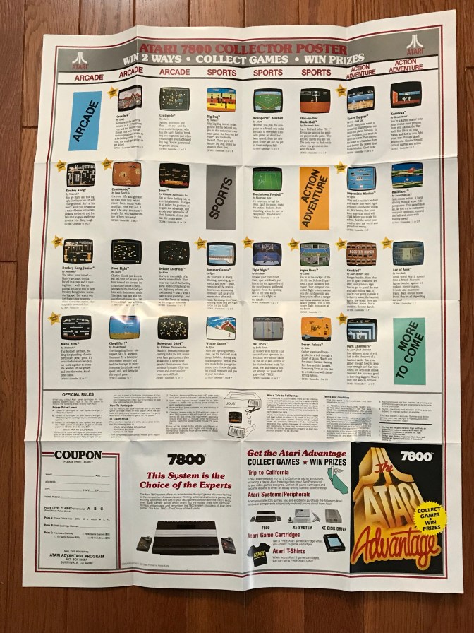 Besides the 4 sealed games I mentioned and the loose Dig Dug, I also picked up complete in box copies of Ballblazer, Crack’ed, Joust, Mario Bros & Winter Games as well as the manual for Centipede. Joust is stellar and Mario Bros is solid but not as good as the NES version in my opinion. The rest I haven’t spent enough time with to fully assess. My copy of Ballblazer, which sounds amazing thanks to the Pokey chip, included a cool poster indicating the available games for the 7800 at the time it was released along with a contest of sorts where you could collect 7800 games (as if they were baseball cards or Garbage Pail Kids) and submit proofs of purchase to get another free game. On the other side of the poster, there is a sweet looking animated collage titled “The Atari Advantage” that includes drawings of the 7800, XEGS & 2600 Junior consoles as well as characters from the various games available on those systems.