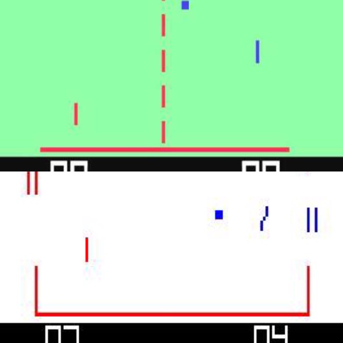 Anyone who has ever played Video Olympics for the Atari VCS/2600 will have a very good idea of how these two variations of Pong work. In Hockey, you battle an opponent (Hockey and Tennis are 2 player only) by controlling both a hockey player (as a vertical line on the screen) and a goalie (as two vertical lines on the screen positioned in the goal on the far side of the playfield) simultaneously over a white playfield. The hockey player can move left/right and up/down covering the entire rink while the goalie can only defend his goal by moving up and down. What makes Hockey on the Channel F/VES a bit more unique & challenging is how you have to manipulate the controllers to switch back and forth between the hockey player and the goalie. This is done by pulling up (to move up) and pushing down (to move down) on the knob that sits at the top of the controller. Fortunately, this only takes a little while to get the hang of. Additionally, you have the ability turn your hockey player 45 degrees to achieve those all important angled shots by twisting the upper knobs. Just make sure you don’t accidentally turn the angle of your player the wrong way and score on your own goal! The combination of these features utilizing the innovative hand controllers are what make Hockey on the Channel F/VES that much more interesting and fun than on similar consoles. I definitely recommend playing at the highest speed (option 4) as the slower pucks in speed options 1-3 provide little to no challenge if both players are equally skilled.