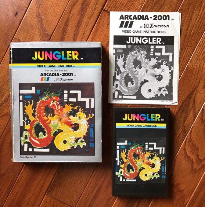 Jungler is that rare title for the Arcadia-2001 from the standpoint that it’s actually a port of an arcade game, albeit an obscure one. Most Arcadia 2001 games are “original” (note the use of quotations) 1st party titles developed in house by Emerson. Jungler, on the other hand, was developed for arcades by Konami. Jungler is another maze game where you control what appears from the box art to be a sort of multi-segmented dragon like creature. The goal of the game is to defeat your enemy, another equally segmented dragon-like creature, by firing at the body or tail segments from behind. Your opponent can do the same to your creature so it’s in your best interest to not let it follow you or get behind you for long. Once your creature is larger/longer than your enemy after shooting enough segments, you can defeat it by meeting it head on. If you meet your opponent head on while you are the same size or smaller, you will lose a life. Throughout each maze, an energy ball will show up at the top of the screen periodically, allowing whoever eats it to re-gain a segment of its body in addition to gaining bonus points.