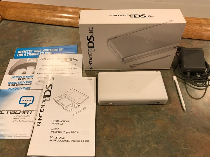 Currently in my collection: white DS Lite in box with manual, inserts, Pictochat manual and AC adapter