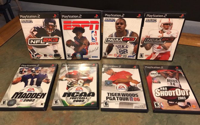 As for the sports games, they all served a purpose at the time. For example, in the fall/winter of 2002, I was changing jobs and had taken a new one in a new town in a new state after having just gotten married only a month prior! During this time, I was living out of a crummy motel and my wife hadn’t joined me in the new town yet so I needed something to keep me occupied while I wasn’t at work. My motel was right next to a ShopKo department store so I walked over and bought a copy of 989 Sports’ “NBA Shootout 2003” in order to play a full 82 game season. Of all the basketball games available to me from EA Sports and Sega Sports, I picked up “NBA Shootout” because the cover athlete was Ray Allen of the Milwaukee Bucks, my favorite team. It’s as simple as that. Put an athlete from a Wisconsin professional or college team on the cover and I’m likely going to buy it. At the end of the PS2 life cycle I had many of the major sports covered. I had college basketball (“NCAA College Basketball 2K3” from Sega Sports), college football (“NCAA College Football 2K3” from Sega and “NCAA Football 2002” from EA), more NBA (“ESPN NBA 2K5” from Sega), NFL (“NFL 2K3” from Sega and “Madden 2002” from EA) and golf (“Tiger Woods PGA Tour ’06” from EA) and they all got serious playtime. No baseball or hockey games found there way into my collection this go ’round. Baseball games fell out of favor with me post 8-bit era. Of the sports game developers during the PS2 era, I was especially a fan of the Sega Sports line of games but also EA Sports’ “Tiger Woods” golf game in particular. Good times but I certainly miss Sega Sports alternatives and I think they did a wonderful job with everything they made in that short period of time of the late 90s and early 00s.