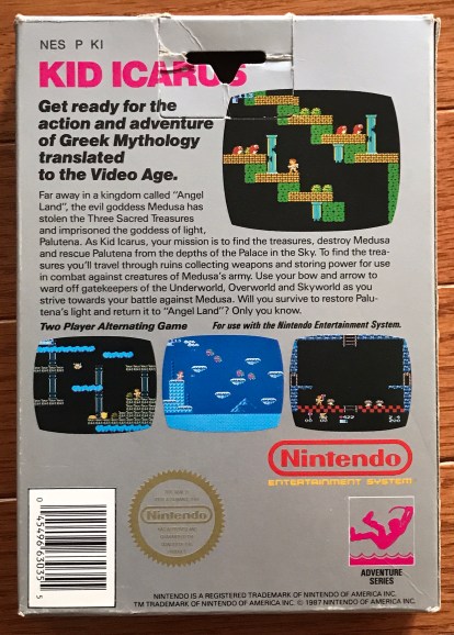 “Kid Icarus” was the first of these three iconic adventure series titles released in the summer of ’87. The cover of the box shows the game’s hero, Pit, floating in the air (giving you the impression that he can fly) while a brown and yellow enemy floats in front of him. There’s a green blob (a bush) between them and a yellow and orange blob (an explosion of sorts) directly below Pit. There’s also what appears to be a layer of clouds above and a column to the right of the brown/yellow enemy. None of these images provide a whole lot of clarity to what the game is about but the back of the box certainly helps.