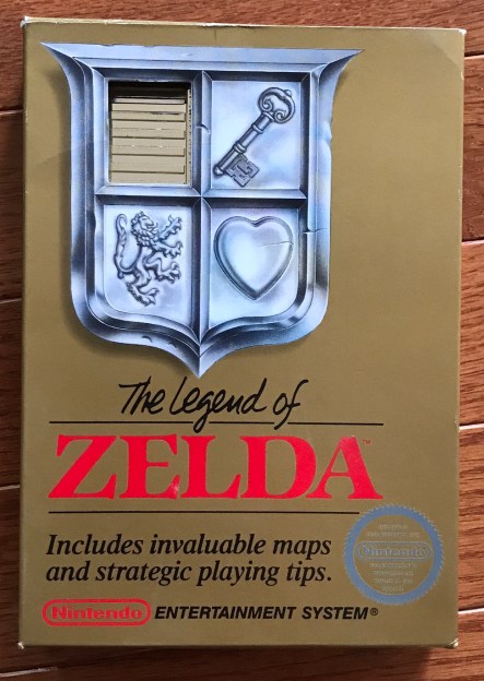 With that said, there was no game that could compete with golden boxed “The Legend of Zelda” in terms of influence and popularity from the moment it was released. While “Metroid” and “Kid Icarus” certainly ushered in a new era for the NES with the adventure series and silver boxes/silver game labels, Nintendo took that approach to new extremes when “The Legend of Zelda” was released by offering the game with a gold colored box and matching gold cartridge. The front of the “Zelda” box is the first of Nintendo’s “series” games to not include a drawn sprite based picture representing the game’s graphics as well as not including a photo of the series icon in the lower left corner. Instead, the “Zelda” box contains a graphic of what appears to be a crest of sorts, with four quadrants and pictures in three of those quadrants. In the lower left quadrant has a picture of a lion, the lower right has a heart, the upper right has a key and the upper left has an empty space. When the “Zelda” cartridge is inserted into the box properly, you can see the ridged section of the cart showing through this hole which then becomes part of the crest. It’s a very cool effect that had a lot of impact and wow factor while the games sat on the store shelves. There was no mistaking that distinct golden colored box for anything other than what it was, the best game available for the system at the time.