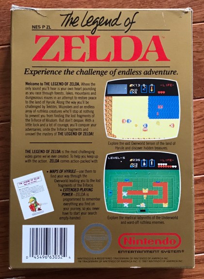 The back of the box also claims that “The Legend of Zelda” is the most challenging video game Nintendo ever created and included inside is the “Maps of Hyrule”, which is better known as the “Maps and Strategies” pamphlet. Additionally, the box indicates that the cartridge has special “extended playing power” capabilities, programmed to remember everything you find on your journey, so you never have to start your search empty-handed. Of course this is just Nintendo’s fancy way of saying that “Zelda” comes with a battery that allows you to save your game progress to the cartridge itself. The inclusion of a battery back-up save feature had never been attempted before, so I can understand why Nintendo didn’t want to cause confusion for the buyer. At the time, we didn’t care how it was accomplished, we just cared that “The Legend of Zelda” offered a new gaming experience that none of us had ever witnessed….and it all started with that eye catching golden box.